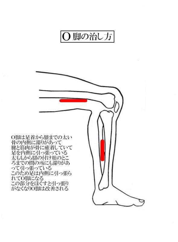 O脚は足首から膝までの太い骨の内側に滞りがあって、腱と筋肉が骨に癒着していて、足を内側に引っ張っている。