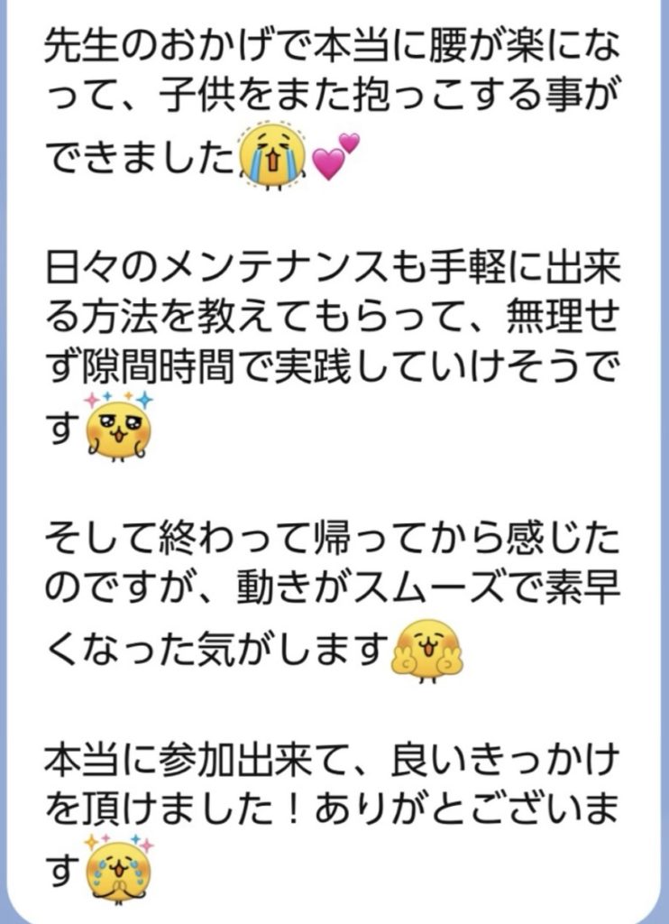 重度の腰痛で息子さんを抱っこできずに辛い思いをされていた女性。