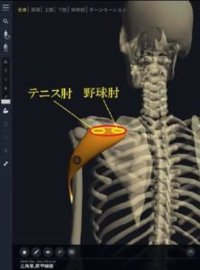 野球肘は、三角筋・肩甲棘部の肩甲骨背骨側を念入りにほぐす。