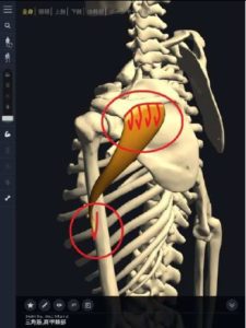 三角筋・肩甲棘部が肩甲骨にくっついて硬縮している。